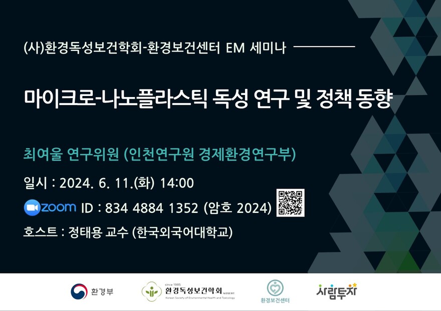 여섯번째로, '마이크로-나노플라스틱 독성 연구 및 정책 동향'을 주제로 최여울 연구위원님(인천연구원)의 세미나를 진행하오니 많은 관심과 참여 부탁드립니다.