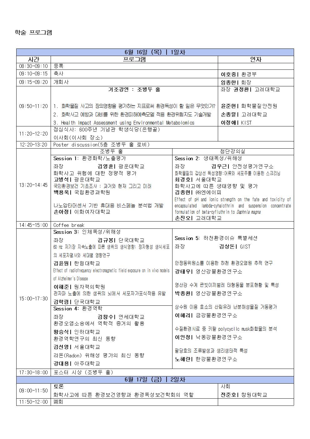 안녕하세요. 환경독성보건학회입니다.여러분들의 더 많은 참여로 학술대회가 풍성해 질수 있도록사전등록 및 초록접수 기간을 6.2일(목) 24시까지 연장하였습니다.(이후 추가 연장은 없으니 꼭 유념하시길 바랍니다.)많은 참여 바랍니다.감사합니다.