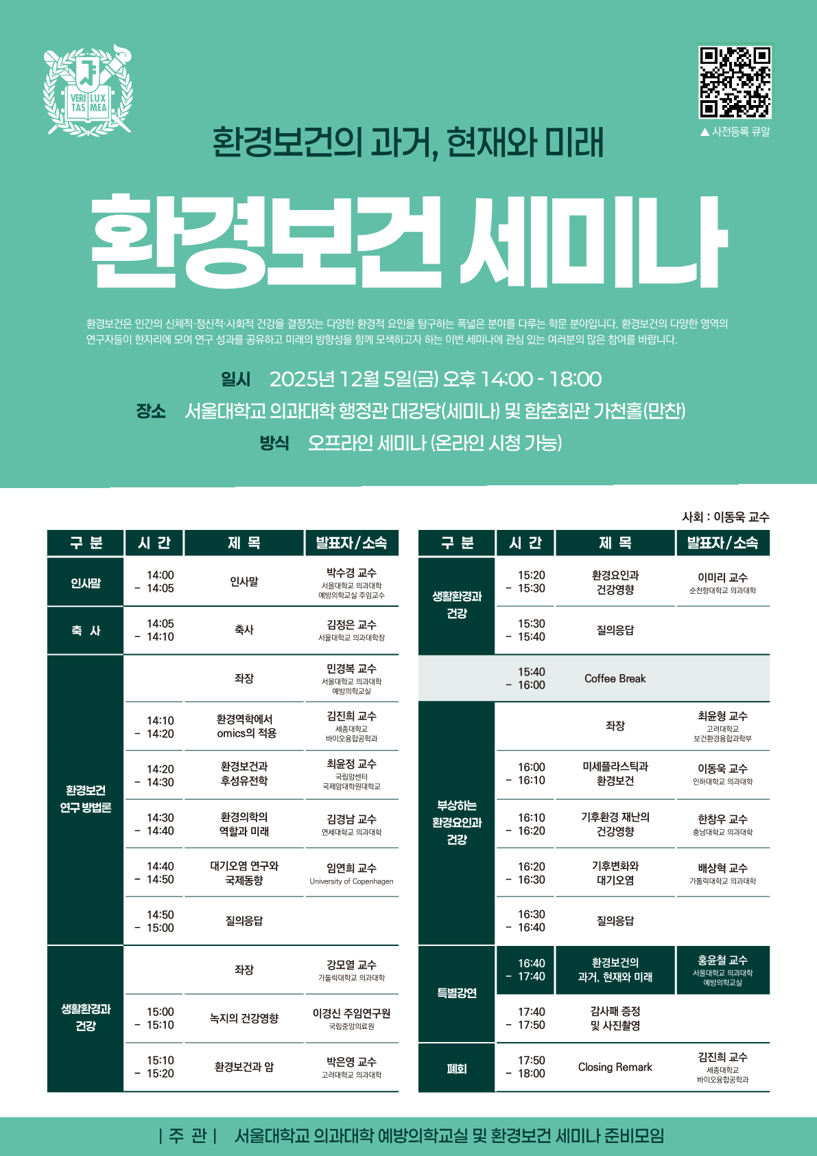 2025년 12월 5일(금) 오후 2시, "환경보건 세미나: 환경보건의 과거, 현재와 미래"를 개최합니다.