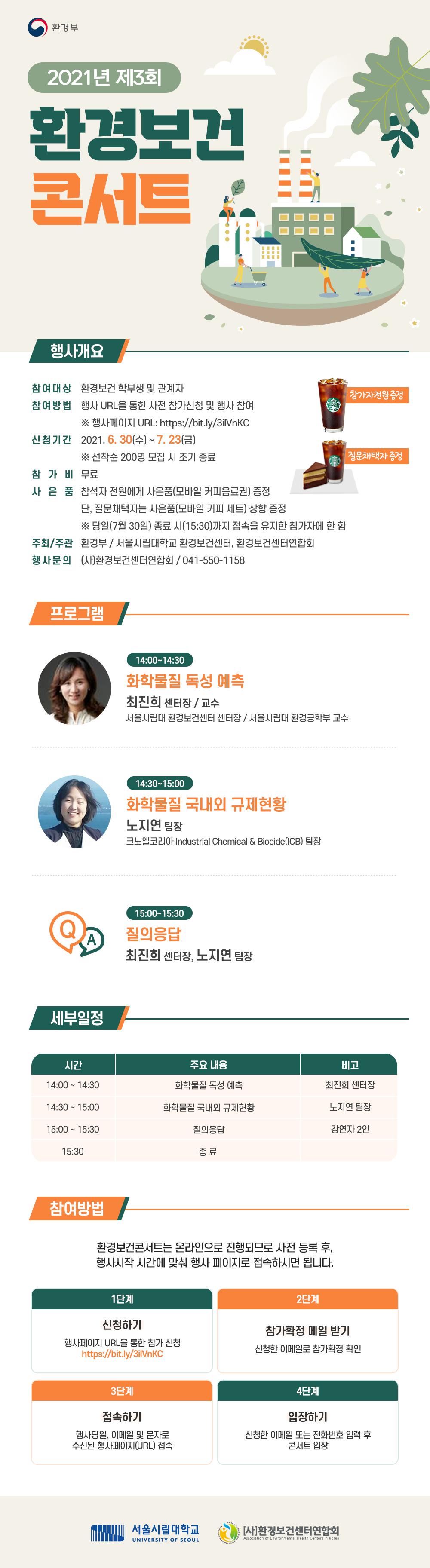 환경부에서 환경보건전문가들과 함께 환경보건 관련 전공 학생 및 관계자를 대상으로 환경보건에 관한 강연과 더불어 참여자들과 질문·답변의 시간을 갖는「환경보건콘서트」를 개최하고자 하오니 적극 참여하시어 환경보건에 관한 정보 교류의 장이 되실 수 있기를 희망합니다.