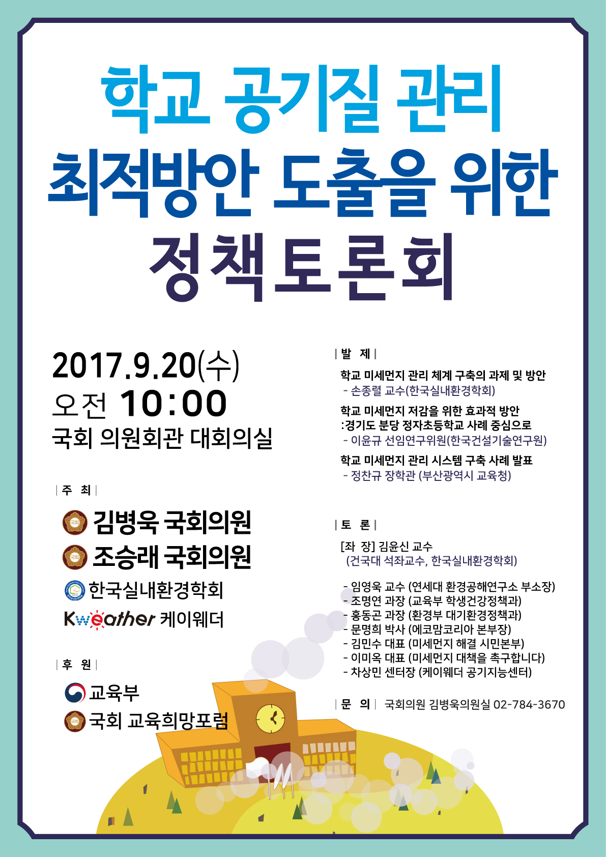 | <‘학교 공기질 관리 최적방안 도출을 위한 정책토론회’ 개최 안내> 케이웨더가 김병욱 의원, 조승래 의원과 함께 오는 20일 오전 10시부터 국회 의원회관 대회의실에서 ‘학교 공기질 관리 최적방안 도출을 위한 정책토론회’를 개최합니다. 지난 7월 22일 국회에서 초등학교 공기정화장치 설치 시범사업에 추가경정예산 90억원이 편성되었습니다. 사업 시행에 앞서 담당 공직자, 전문가, 시민단체 구성원이 모여 교내 미세먼지를 체계적으로 관리하고, 정부 예산을 효과적으로 사용할 수 있는 방안을 모색해보고자 합니다. 토론회는 △학교 미세먼지 관리 체계 구축의 과제 및 방안 △학교 미세먼지 저감을 위한 효과적 방안 △학교 미세먼지 관리 시스템 구축사례 발표 후 패널 토의 순으로 진행됩니다. 아이들이 미세먼지 걱정 없는 교실에서 공부할 수 있도록 많은 관심과 참여 부탁드립니다. 토론회 참석은 9월 20일까지 토론회 사전등록 페이지(http://naver.me/Fr4aBhrV)를 통해 신청할 수 있습니다. 감사합니다. 케이웨더 대외협력팀 |
