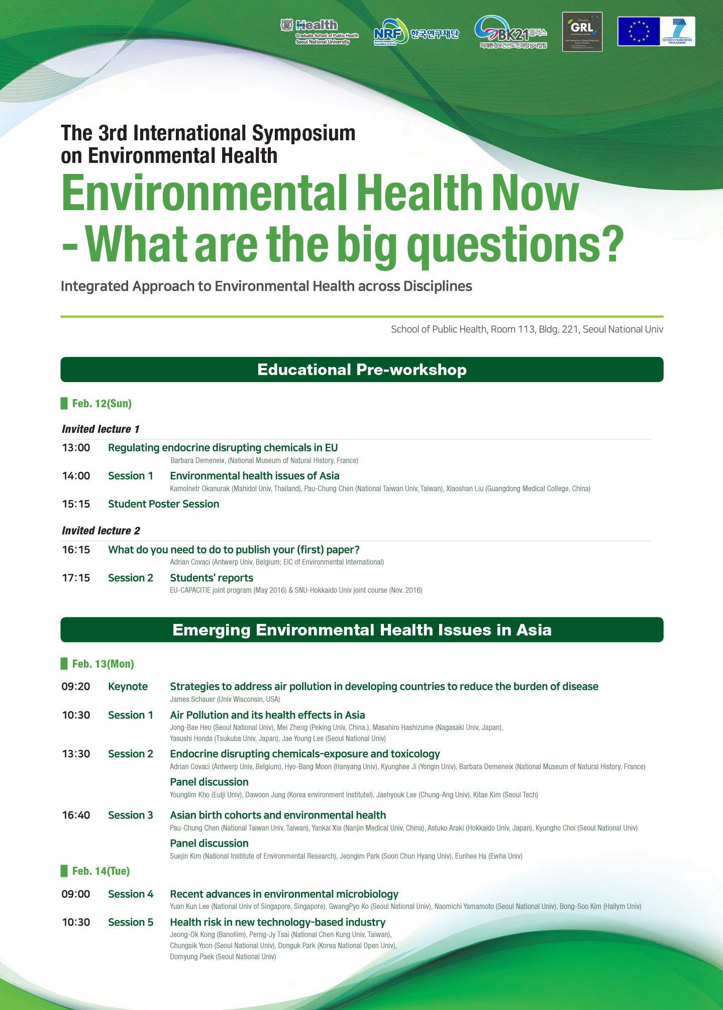 | <The 3rd International Symposium on Environmental Health> Environmental Health Now- What are the big questions? Integrated Approach to Environmental Health across Disciplines Date: Feb 12, 2017 (SUN) Venues: Graduate School of Public Health (Room 113 of Bldg 221, 7th Floor Lobby of Bldg 220) Date: Feb 13~14, 2017 Venues: Graduate School of Public Health (Room 113 of Bldg 221, 7th Floor Lobby of Bldg 220) |